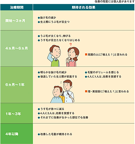 副作用に両者で大きな違いはなく、デュタステリド臨床試験では勃起機能不全(ED)が4.3%(日本人限定は5.0%)、リビドー減退(性欲減退)が3.9%、精液量減少が1.3%、その他にも発疹、頭痛、抑うつ気分、乳房障害などが報告されています。効果の発現は早い方であれば4か月、遅くても6か月で毛髪の成長を感じられます。改善した状態を継続するためには、続けて服用していただく必要があります。
